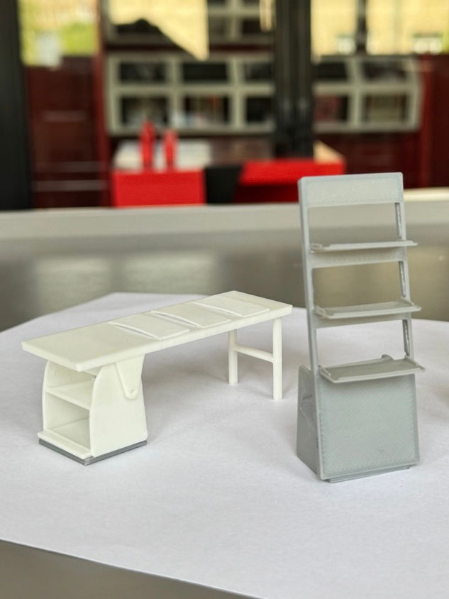 Дополняют проект мобильные скамьи, демонстрационные тумбы и стеллажи, создавая